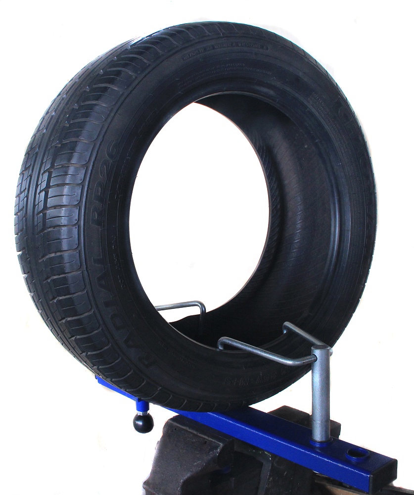 Прибор имеет простую конструкцию: это опорная планка с крюками-зажимами, которые устанавливаются на борта шины, а затем разводятся в стороны нажатием на рычаг. Один зажим может перемещаться по планке, позволяя устанавливать покрышки различной ширины, и закрепляется винтом.