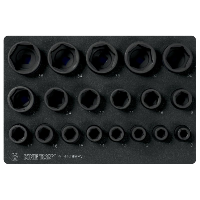 Набор ударных торцевых головок 1/2", шестигранные, 10-36 мм, ложемент, 19 предметов, KING TONY, 9-4429MPV