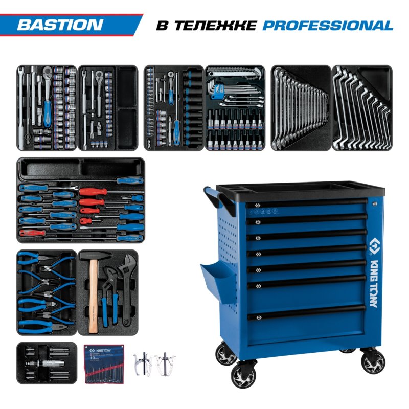 Набор инструментов 204 предмета, "BASTION", в синей тележке KING TONY 9G38-100MRB купить в Новосибирске цена ✅ - Все для СТО