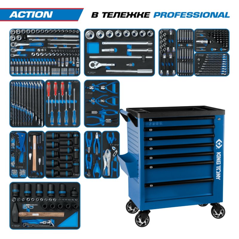 Набор инструментов 327 предметов, "ACTION", в синей тележке KING TONY 9G38-327MRVB купить в Новосибирске цена ✅ - Все для СТО