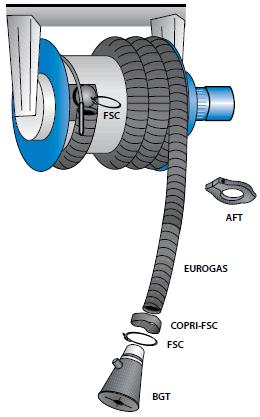 Катушки металлопластиковой конструкции со шлангом и насадкой для удаления выхлопных газов любых легковых автомобилей. Для удаления выхлопных газов катушки напрямую соединяются с вытяжным центробежным электровентилятором.
