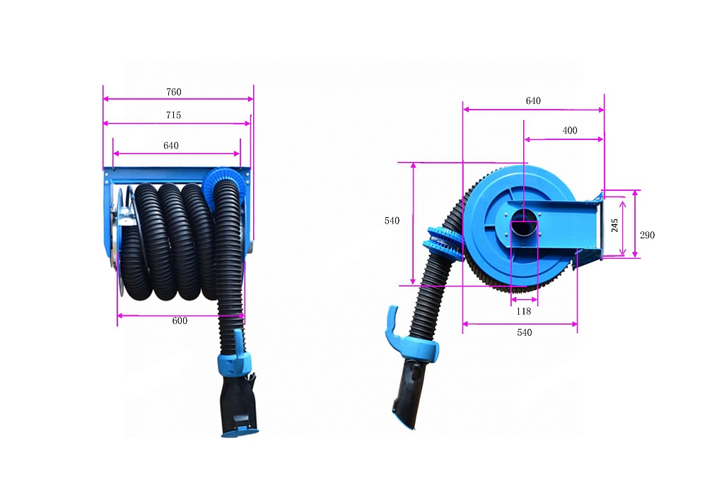 Для максимальной эффективности рекомендуемая длина шланга составляет от 7,5 до 15 метров при диаметре 75 мм. Возможно использовать шланг большей длины в сочетании со стопором в случае, если катушка расположена высоко. Всю систему можно подключить к центральной вентиляции.
