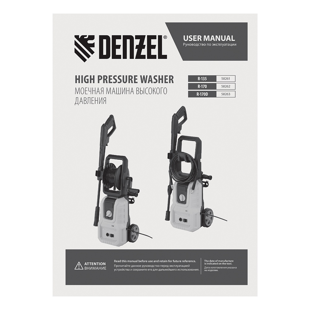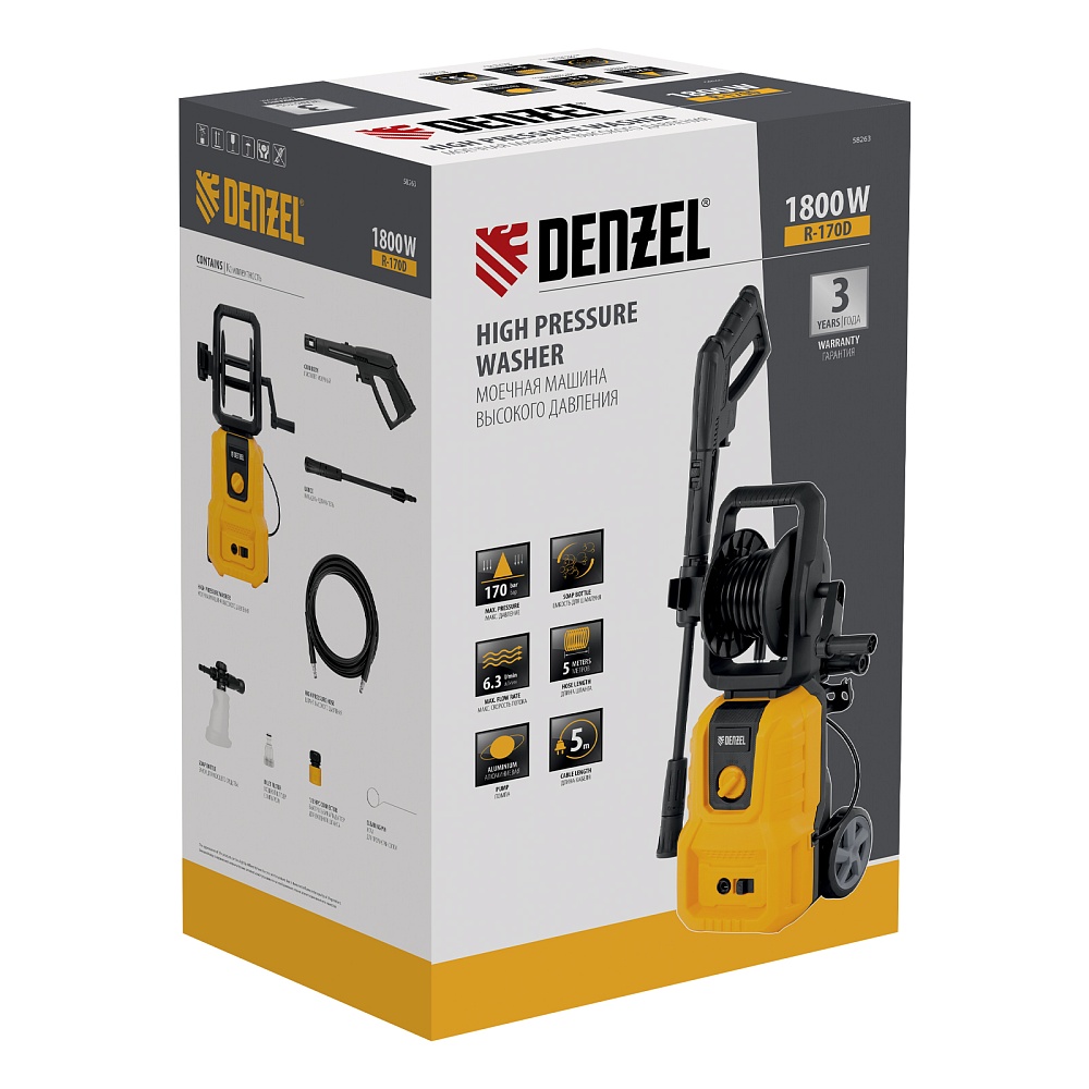 <p>Моечная машина высокого давления Denzel R-170D 58263 с барабаном, мощностью 1800 Вт, поддерживает максимальное рабочее давление 170 бар и обеспечивает объем подачи воды 380 л/ч. Позволяет быстро и эффективно очистить садовый инвентарь, фасад дома, дорожку, отмыть автомобиль и т.д. Оснащена самовсасывающим насосом, поэтому может работать даже без подключения к водопроводу — подойдет любой резервуар или емкость с водой. Машина оптимальна для бытового использования.</p><h2>Преимущества</h2><ul><li>Долговечность — надежная алюминиевая помпа со стальными плунжерами выдерживает высокие нагрузки и обеспечивает стабильное давление в течение всего срока службы машины.</li><li>Эффективное очищение — для получения качественного результата можно использовать моющее средство (пеногенератор входит в комплект поставки).</li><li>Простая подготовка к работе — быстросъемный адаптер облегчает подключение шланга подачи воды.</li><li>Защита от засорения — фильтр входного штуцера задерживает посторонние частицы, продлевая срок службы помпы.</li><li>Продуманная комплектация — машина поставляется с иглой для прочистки сопла, что упрощает уход за техникой.</li><li>Класс защиты II — токопроводящие элементы надежно изолированы для защиты пользователя от получения электротравмы.</li><li>Безопасность — перед началом работы необходимо разблокировать рычаг моечного пистолета для предотвращения случайного запуска.</li><li>Защита от превышения максимально допустимого давления — машина оснащена перепускным клапаном, манометрический выключатель останавливает насос при отпущенном рычаге пистолета.</li><li>Термозащита — производитель предусмотрел датчик температуры и автоматическое отключение двигателя при перегреве.</li><li>Комфортная эксплуатация — барабан для шланга высокого давления упрощает работу, длина кабеля и шланга высокого давления составляет 5 м, что позволяет свободно передвигаться по участку.</li><li>Мобильность — благодаря рукоятке и колесам моечную машину удобно перемещать.</li><li>Гарантия 3 года — высокое качество техники подтверждено производителем.</li></ul>