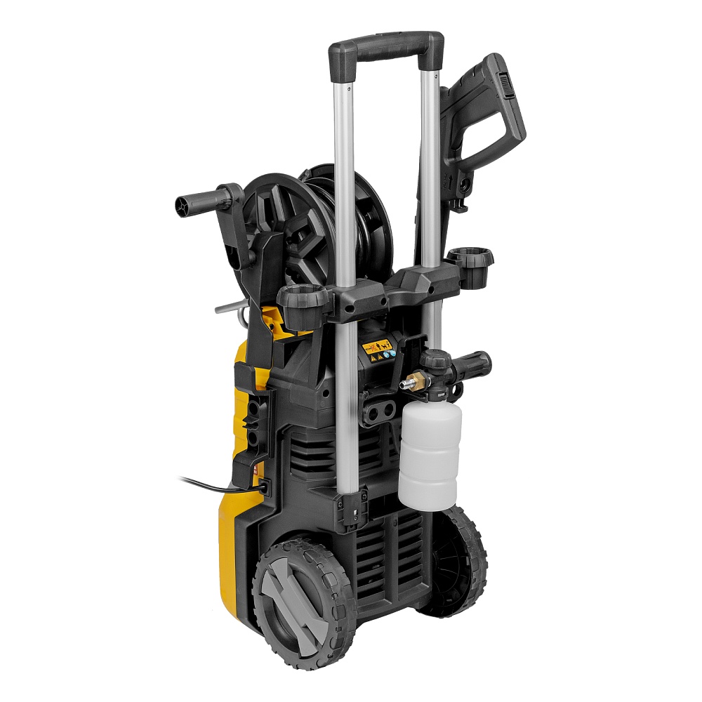 Мойка высокого давления, Барабан для шланга (установлен), Шланг высокого давления (установлен), Пистолет, Удлинитель пистолета, Сменные сопла 3 шт, Пеногенератор с бачком для моющего средства, Входной штуцер с фильтром, Быстросъемный коннектор шланга, кронштейн-держатель пистолета, Кронштей сетевого кабеля, Игла для прочистки сопла, Комплект крепежа, Инструкция с гарантийным талоном