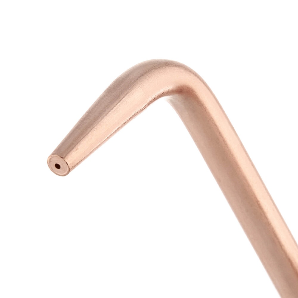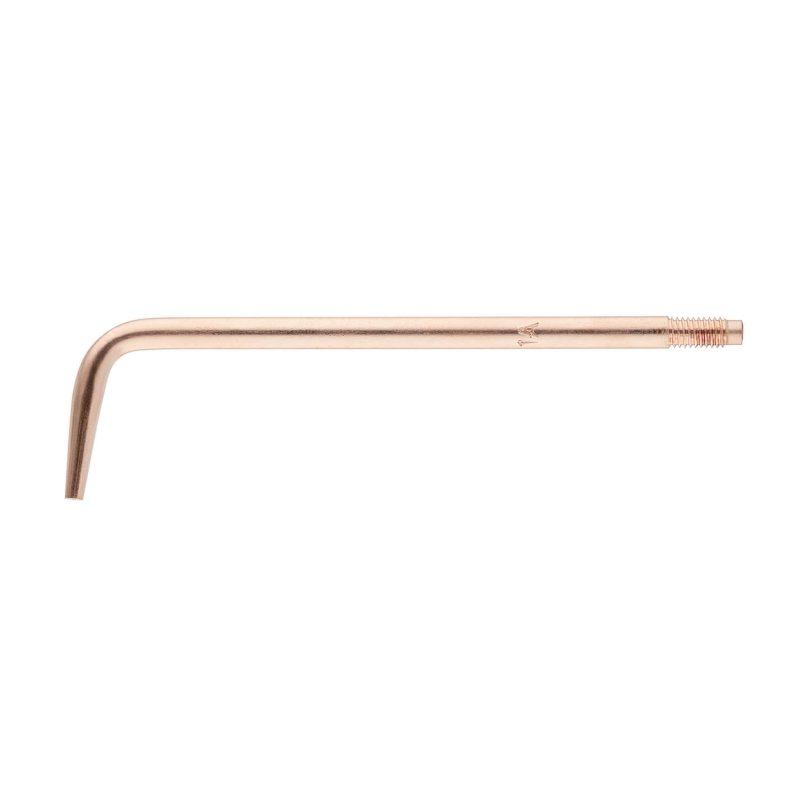 Медный цельнотянутый наконечник №1А для сварочной ацетиленовой горелки Г2А-4М-02. Предназначен для газопламенной обработки металлов толщиной 0,5–1,0 мм. Угол изгиба носика наконечника – 90°.