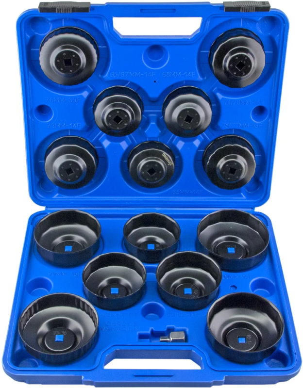 - Комплект съемников включает съемник-краб 65-110 мм, переходник с квадрата 3/8 на квадрат 1/2 дюйма и 14 съемников "чашка" (65х14гр., 65/67х14гр., 68х14гр., 73х14гр., 74/76х15гр., 75/77х15гр., 76х14гр., 76х30гр., 80х15гр., 80/82х15гр., 90х15гр., 93х15гр., 93х36гр., 100х15гр.).