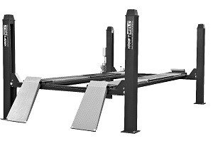 Четырехстоечный подъемник относится к платформенному типу грузоподъемных механизмов и предназначен для поднятия автомобилей под колеса. По типу исполнения и назначения данные подъемники подразделяются на два типа: с платформами под «сход-развал» и с гладкими платформами. Подъемники первого типа используются совместно со стендами регулировки углов установки колес автомобилей, а второго типа предназначены для проведения общеслесарных работ, не связанных с обслуживанием подвески автомобиля. Наибольшее распространение получили электрогидравлические подъемники, постепенно вытеснив электромеханические из-за простоты обслуживания и более тихой работы.