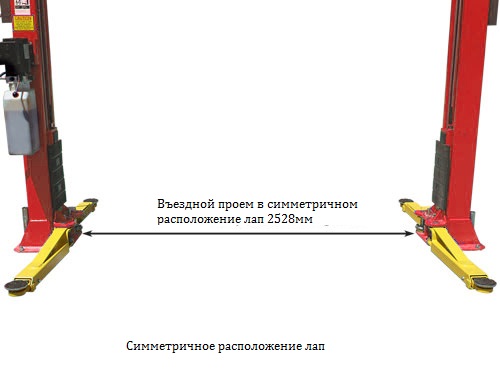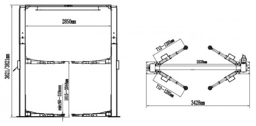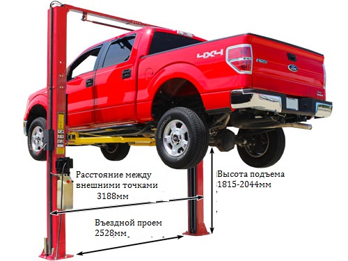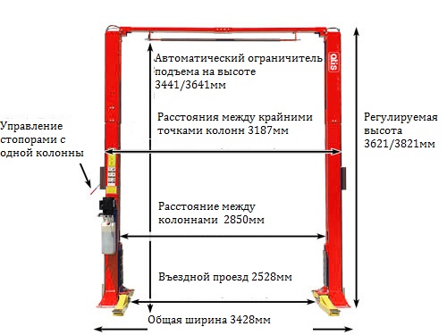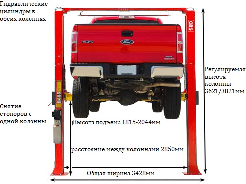 Двухстоечный электрогидравлический подъемник с верхней синхр, грузоподъемность 4.0 т, высота колонны 3621/3821мм, механическое управление стопорами на одной колонне.