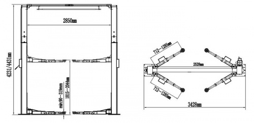 Двухстоечный электрогидравлический подъемник с верхней синхр, грузоподъемность 4.0 т, высота колонны 4231/4431мм, механическое управление стопорами на одной колонне.