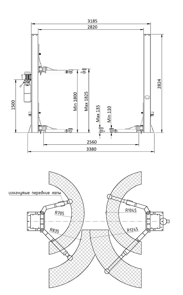 .         Изогнутые передние лапы позволяют поднимать короткобазные автомобили.