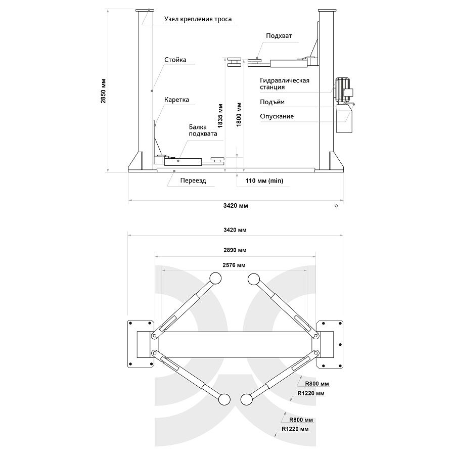 Объем бака гидронасоса 10 л. Общая высота 2850 мм