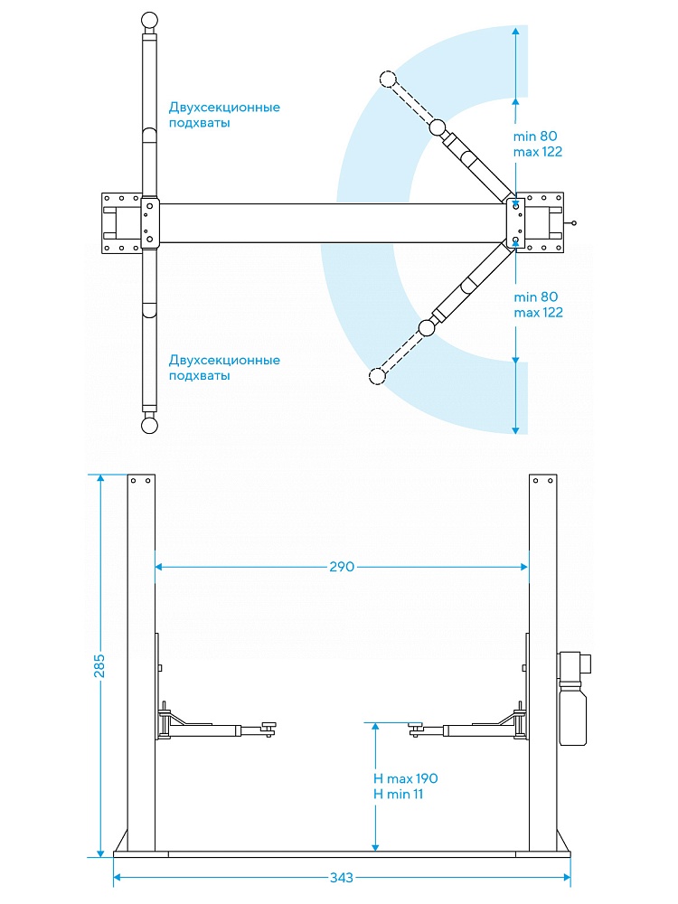 Подъемник двухстоечный электрогидравлический, асимметричные каретки, цилиндры прямого действия, г/п 4200 кг., 2,2 кВт, высота подъема 1910 мм., расстояние между стойками 2840 мм., с верхней синхронизацией стальным тросом.