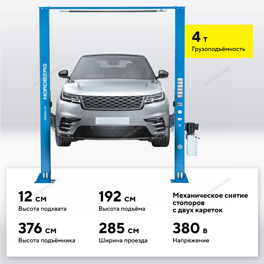 NORDBERG N4121H-4T_380 — электрогидравлический двухстоечный подъёмник с верхней синхронизацией, грузоподъёмностью 4 тонны, 380 В.