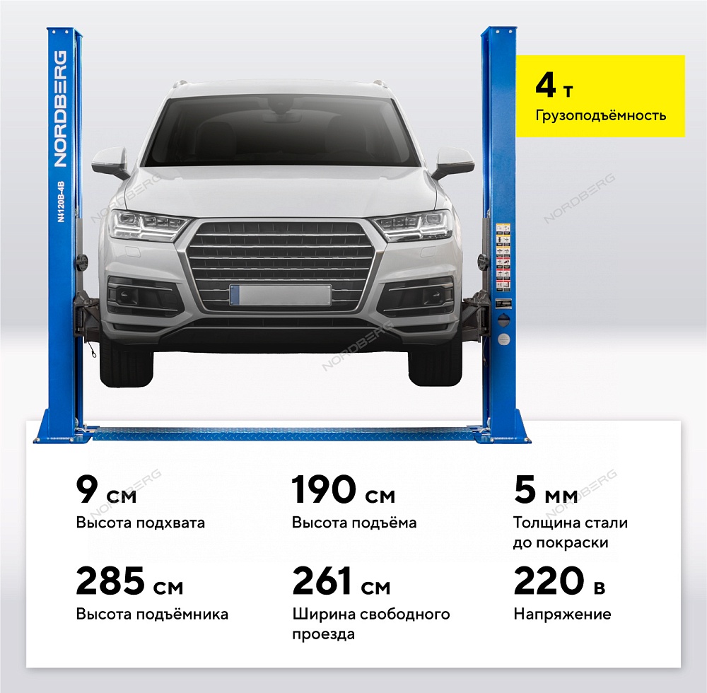 Подъемник двухстоечный 4 т, 220 В, синий NORDBERG N4120B-4B_3+2_220 купить в Новосибирске цена ✅ - Все для СТО