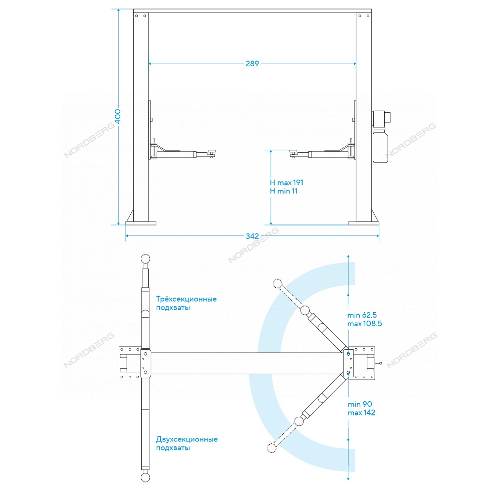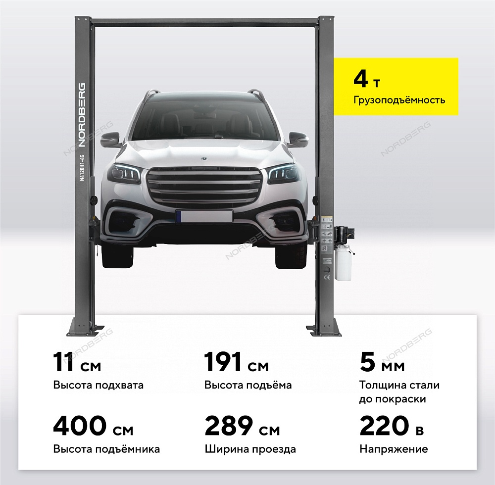 Подъемник двухстоечный 4 т, верхняя синхронизация, H=4 м, 380 В, серый NORDBERG N4120H1-4G_3+2_380 купить в Новосибирске цена ✅ - Все для СТО