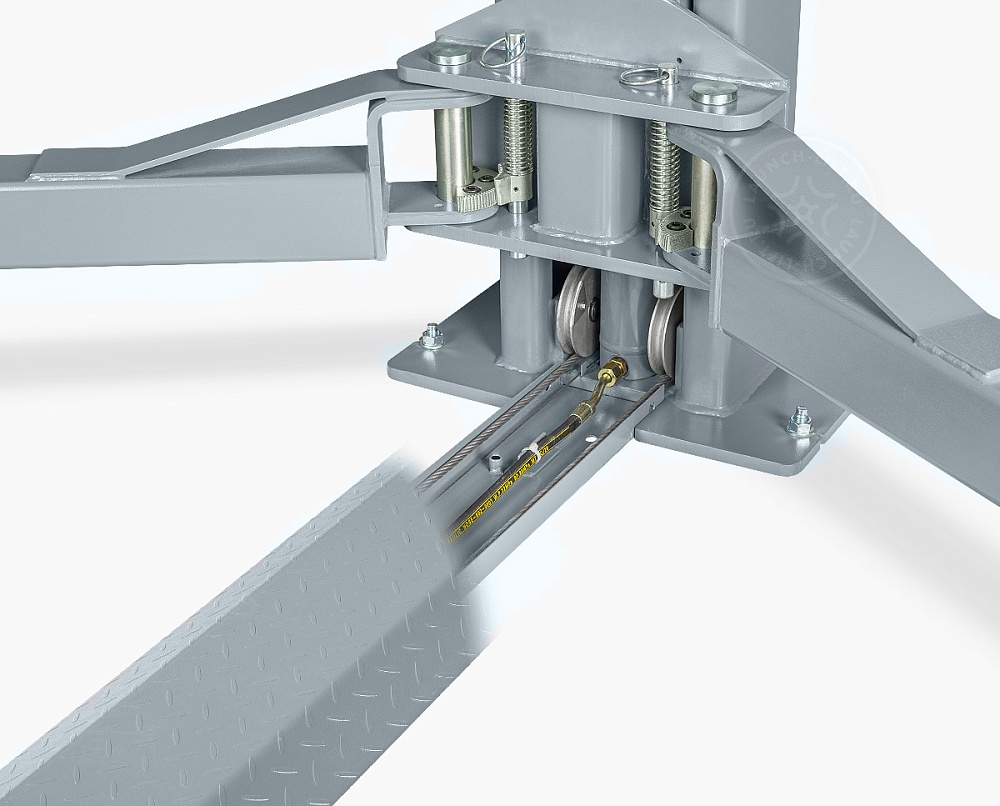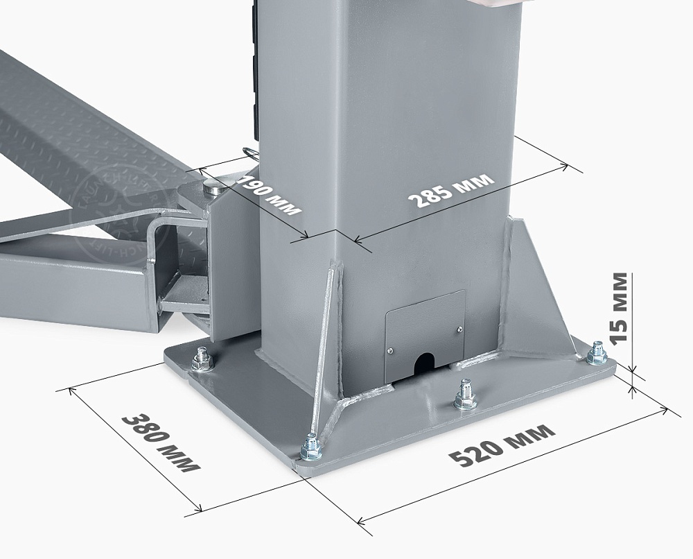 Управление стопорами с одной колонны при помощи автоматизированного пульта управления. Расположение гидростанции в верхней части колонны. Универсальные лапы подхвата  (длина передних – до 1120 мм, задних - 1365 мм). Двойной защитный трап. Усиленная конструкция элементов подъемника, шкивы увеличенного диаметра. Толщина металла профиля стойки – 5 мм. Элементы защиты в базовом комплекте поставки (гидравлические парашютные клапаны, защита движущихся механизмов, защитные рамки на лапах подхвата, резиновые накладки по всей высоте каретки). Высота подхвата от 110 мм. Максимальная высота подъема – до 1920 мм. Профессиональный Н-образный форм-фактор каретки.