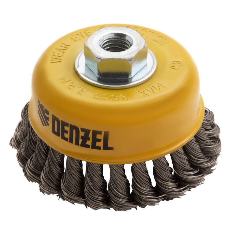 <p>Щетка для УШМ «Чашка» Denzel 746283, М14, диаметром 100 мм, с щетиной из крученой нержавеющей проволоки диаметром 0,5 мм, предназначена для грубой очистки твердых поверхностей от ржавчины, лакокрасочных покрытий, загрязнений, удаления заусенцев, а также для зачистки сварных швов. Снимает толстый слой материала, идеально подходит для обработки изделий из нержавеющей стали. Щетка имеет форму чашки и позволяет очищать участки большой площади. Оснастку устанавливают на вал углошлифовальной машины. Рекомендуемая максимальная скорость вращения составляет 8500 об/мин. Во время работы следует использовать средства индивидуальной защиты — очки, респиратор, наушники, перчатки, а также специальную одежду и обувь. Щетка применяется в строительстве, на производстве, а также в быту.</p><h2>Преимущества</h2><ul><li>Проволока толщиной 0,5 мм, скрученная в пучки, придает щетине устойчивость к повышенным нагрузкам.</li><li>Покрытый эмалью корпус и щетина из нержавеющей стали AISI 201 не ржавеют, поэтому щетку можно использовать в условиях сильной влажности.</li><li>Частицы проволоки из нержавейки, остающиеся на обрабатываемой поверхности, не вызывают ее коррозии.</li><li>Усиленный корпус и гайка обеспечивают повышенную прочность щетки.</li><li>Крепление на гайку М14 ускоряет установку и замену оснастки.</li><li>Строгий контроль качества на всех этапах производства подтверждает надежность щетки.</li></ul>