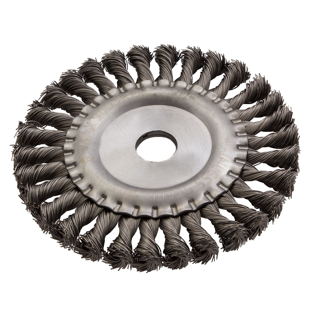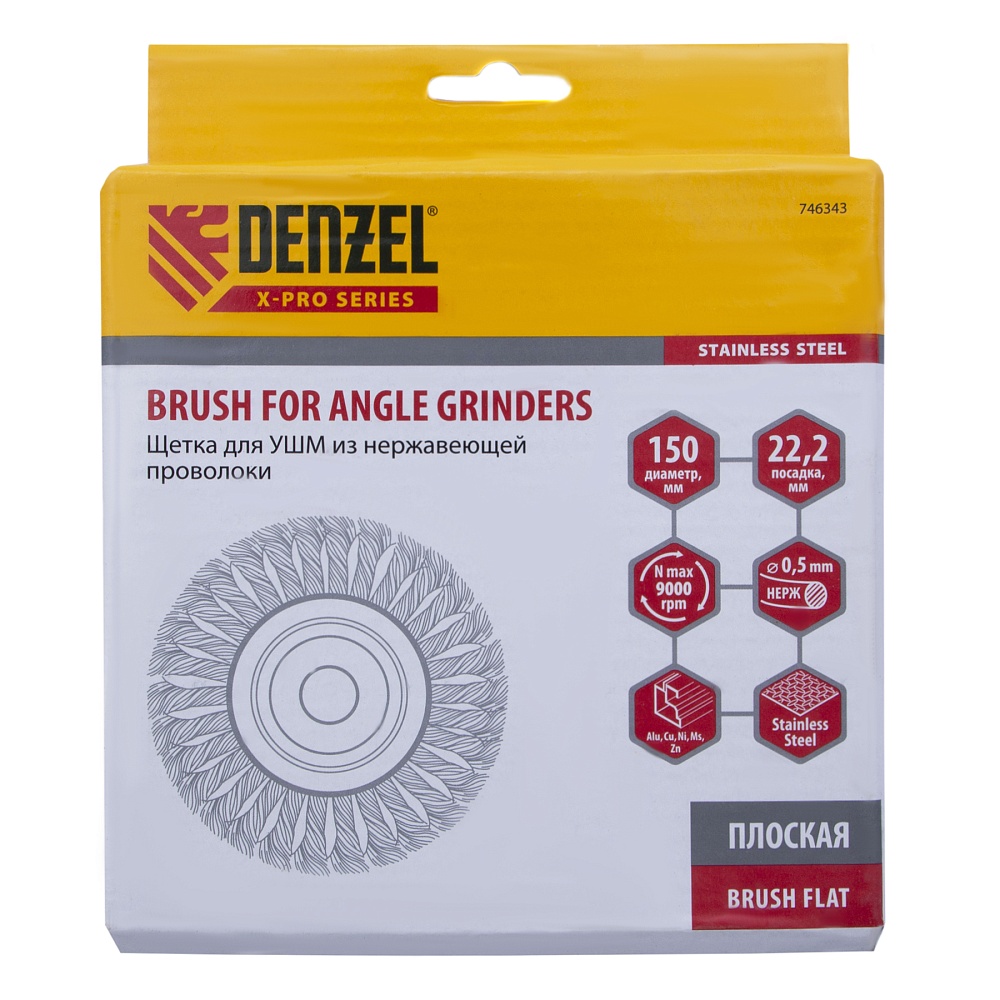 <p>Плоская щетка для УШМ Denzel 746343 диаметром 150 мм, с посадкой 22,2 мм, с щетиной из крученой нержавеющей проволоки 0,5 мм, предназначена для снятия толстого верхнего слоя с металлических, деревянных, бетонных поверхностей. Удаляет загрязнения, ржавчину, старые лакокрасочные покрытия, заусенцы, окалину с ровных поверхностей и в труднодоступных местах. Оптимальна для обработки изделий из нержавеющей стали, а также зачистки сварных швов. Щетку устанавливают на фланец углошлифовальной машины, что удобно для выполнения большого объема работ, не требующих частой смены насадок. Рекомендуемая максимальная скорость вращения 9000 об/мин. Во время работы обязательно использование средств индивидуальной защиты. Щетка будет полезна на строительной площадке, производственном предприятии, а также пригодится в быту.</p><h2>Преимущества</h2><ul><li>Щетина из проволоки толщиной 0,5 мм, скрученной в пучки, выдерживает повышенные нагрузки.</li><li>Оцинкованный корпус и щетина из нержавейки не боятся коррозии, поэтому щетку можно использовать в районах с высокой влажностью.</li><li>Частицы проволоки из нержавеющей стали AISI 201 не вызывают коррозии обработанной поверхности.</li><li>Усиленный корпус обеспечивает щетке повышенную устойчивость к деформациям.</li><li>Технологический контроль на всех этапах производства гарантирует высокое качество оснастки.</li></ul>