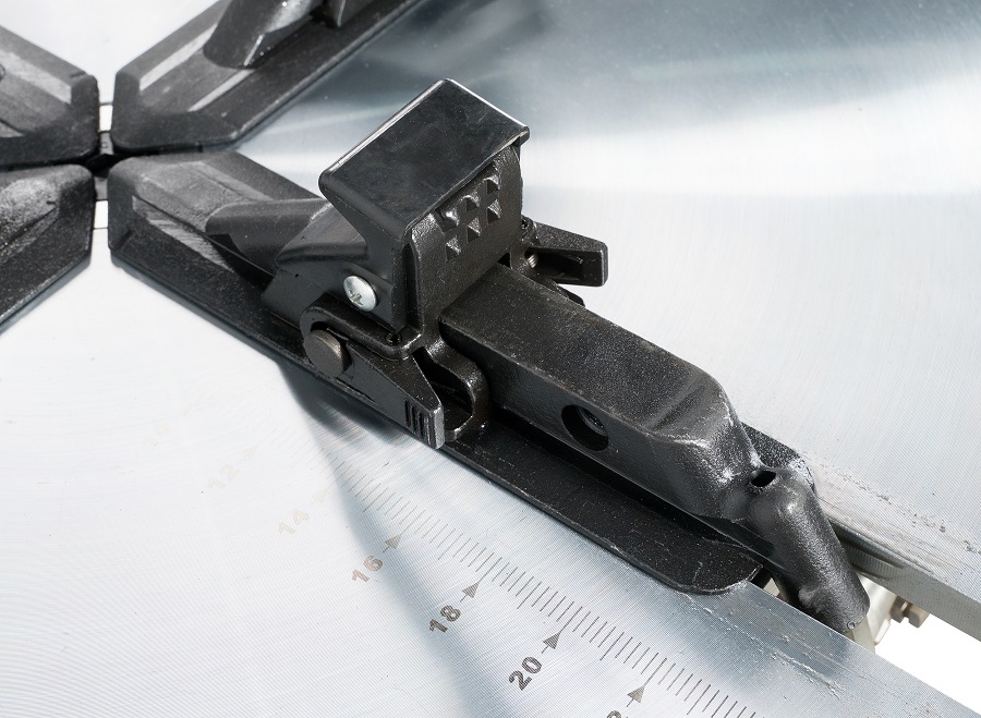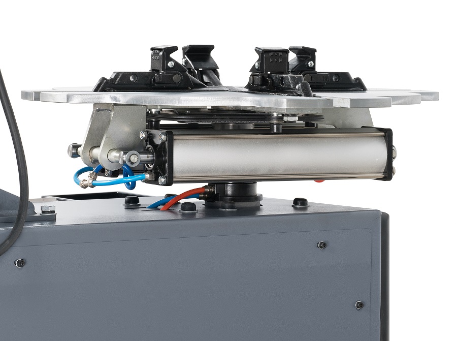 Поворотный стол специальной формы с самоцентрирующимся четырехчулачковым механизмом зажима дисков надежно фиксирует колеса диаметром до 1040 мм.