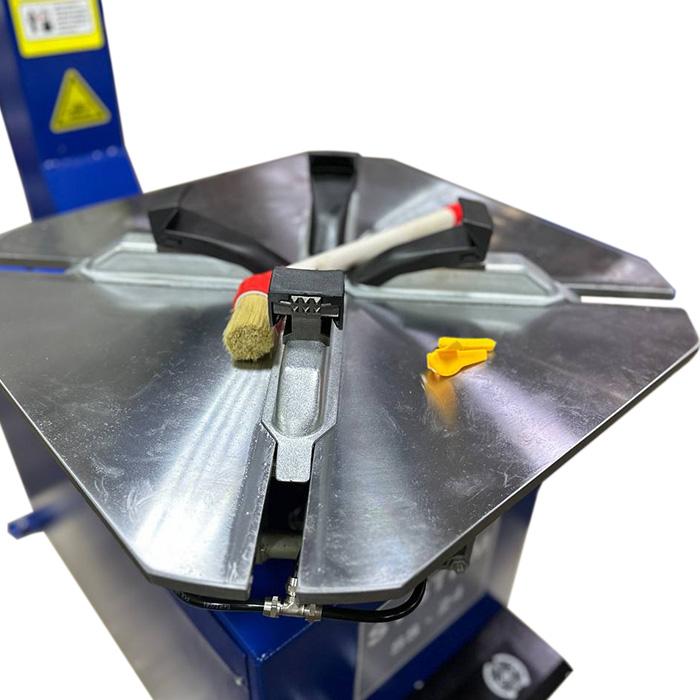 Полуавтоматический шиномонтажный стенд System4you SS-24 для монтажа и демонтажа колес легковых автомобилей, легких грузовиков, небольших автобусов и небольшой коммерческой техники.Монтажный стол позволяет зажимать с внешней стороны диски диаметром 10-21 дюймов, а с внутренней стороны 12-24 дюймов.Рабочий стол диаметром - 610 мм. Толщина металла рабочего стола - 11 мм, обеспечивает отсутствие деформации рабочего стола в процессе работы.Сертифицирован для продажи в России и ЕС. Комплектующие монтажной части шиномонтажного станка изготовлены из высокопрочной стали с шестигранным сечением (толщина 41 мм), что позволяет резко снизить изгиб во время работы.Совместим с дополнительным устройством "Третья рука" напольного крепления – HR-360.Особенности:- Рабочий шток монтажного "гуся" повернут ребрами жесткости в сторону вращения стола, что снижает деформацию "гуся" при работе.- Обновленная конструкция монтажной лапки.- Ролики в монтажной лапке для снижения вероятности поцарапать диск (пластиковые вставки присутствуют).- Монтажная головка с пластиковыми вставками для снижения вероятности поцарапать диск.- Усилие отжима увеличено до 2500 кг для возможности работать с жесткими покрышками, увеличивая скорость работы.- Отжимной цилиндр шиномонтажного станка изготовлен из конструкционной нержавеющей стали с анодированным покрытием.- Реверс монтажного стола (в случае зажима шины позволяет разблокировать монтажную лапу без повреждения покрышки и диска).- Редуктор шиномонтажного станка закрытогого типа не требует смазки и обслуживания. Рабочие детали выполнены из высокопрочной и износостойкой стали.- Быстросъемные элементы пневматической системы выполнены из металла, что значительно уменьшает вероятность поломки.- Пневматические клапана педального блока оснащены металлическими сепараторами, которые предотвращают разбрызгивание масла по внутренним узлам станка.- Электрические части станка выполнены в закрытом исполнении с заземлением для предотвращения удара электрическим током.- Регулятор давления с встроенным влагоотделителем предотвратит попадание воды в пневмосистему станка, что предотвратит коррозию и попадание влаги в колесо.- Встроенный лубрикатор для подачи смазки в пневмосистему станка, обеспечивает смазкой все необходимые узлы и агрегаты для долговечной работы.- Специальное резиновое кольцо на рабочем штоке станка предотвращает удар монтажной головки, при отводе от рабочей поверхности.*Производитель оставляет за собой право вносить изменения в характеристики товара без уведомления потребителя.