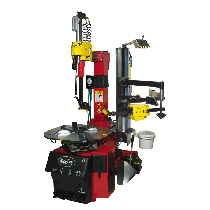 Новая гамма Top Line, четко определена желтым картером машины, объединяет надежную и экономичную систему блокировки,экстра – жесткую вертикальную балку оснащенную запатентованным инструментом безрычажным TECO 480 TOP поставляется со стандартным новым запатентованным автоматическим оборудованием TPH, которое помогает оператору во время монтажа и демонтажа жестких и низкопрофильных шин типа Run-Flat.Колонна отводиться вбок ВЛЕВО.