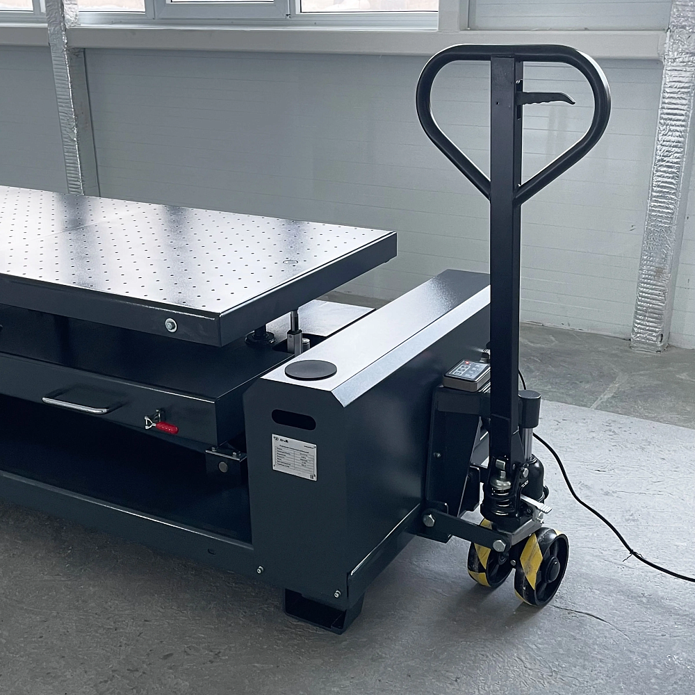 - Мобильность. Передвижной домкрат закреплён перед базовой рамой, что позволяет легко перемещать подъёмник по рабочей зоне.