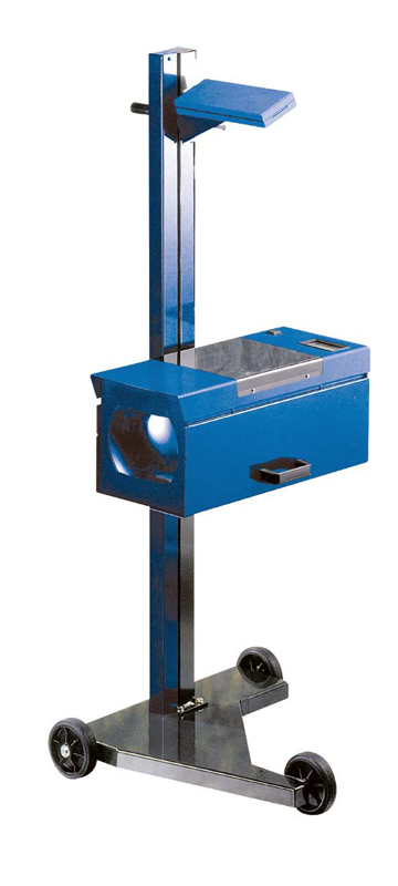 Прибор проверки и регулировки света фар оптико-механический, пластиковый наводчик, электронный люксметр, зеркальный визир, регулируемый измерительный щит, основание на колесиках, неподвижная стойка со скользящими нейлоновыми колодками.