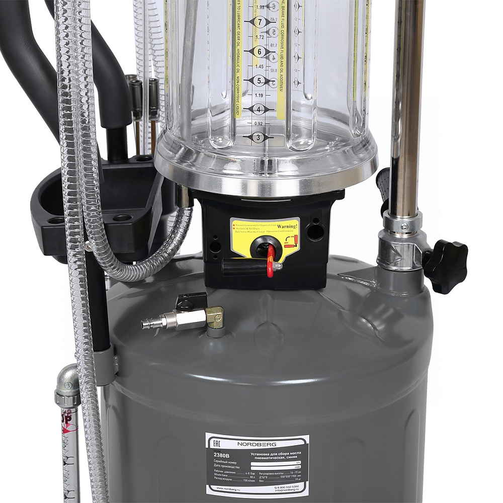 Установка для замены масла NORDBERG (2380) 2380G удаляет отработанное масло и другие жидкости из любого транспортного средства при помощи вентури-вакуумной вытяжной системы.