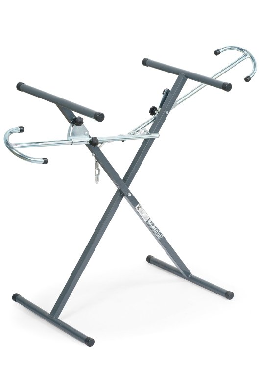 Представляет из себя Х-образную металлоконструкцию с закрепленными на ней регулируемыми по высоте и углу наклона кронштейнами, позволяющими выбрать наиболее удобное расположение детали на стенде. Высота стенда регулируется при помощи фиксации цепочки, соединяющей противоположные стойки между собой, в одном из положений.
